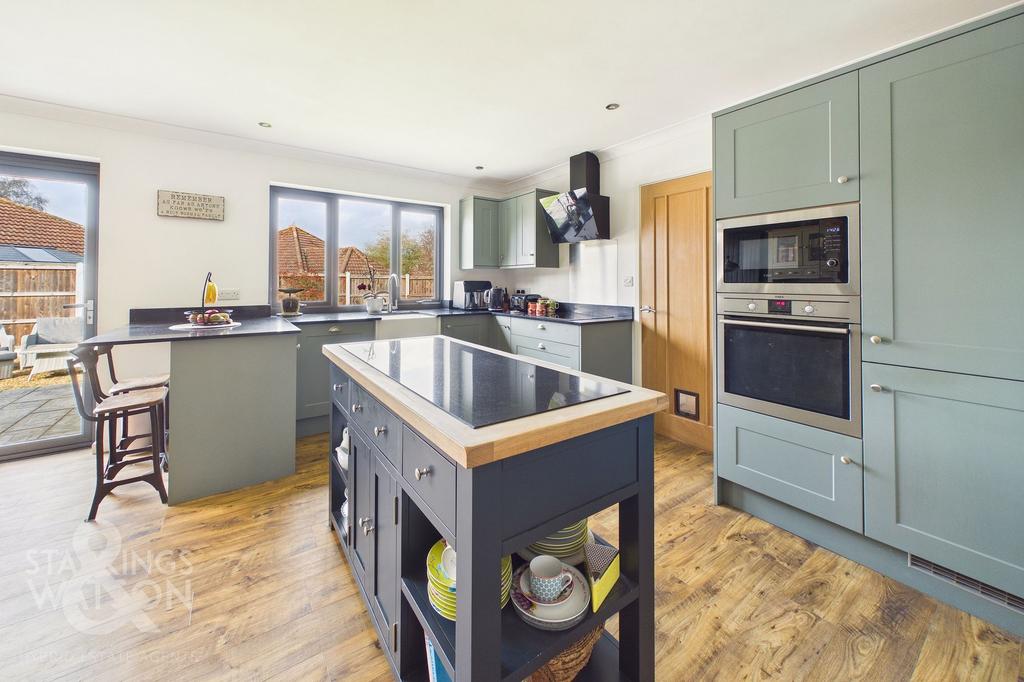 Heading inside, the hall entrance offers a wide and spacious meet and greet space, with a built-in double storage cupboard and doors leading to the bedroom and living accommodation. The main sitting room sits to your right hand side offering an attractive décor with triple aspect views to front and side, with a feature fireplace and wood effect flooring underfoot. Glazed double doors flow seamlessly into the adjacent kitchen/dining room - creating the hub of the home and enjoying a light and bright aspect with garden views. This open plan room offers ample space for soft furnishings and a dining table, with wood effect flooring flowing underfoot. The kitchen itself offers an extensive range of built-in storage with an inset ceramic butler sink with quartz work surfaces. Integrated appliances include an inset electric ceramic hob with stainless steel splash-back and extractor fan, built-in eye level electric oven and microwave combination, with a fridge/freezer and dishwasher. Bi-folding doors open up to the garden whilst a door takes you to a convenient and useful utility room, with further storage space and room for general white goods along with the floor standing oil fired central heating boiler. The ideal guest double bedroom or home office leads off, with dual aspect views to front and side and fitted carpet underfoot. The two main bedrooms lead off the hall entrance including the main principal room which sits to the rear, enjoying garden views with fitted carpet underfoot and a door to a private ensuite shower room. With a contemporary white three piece suite including a hand wash basin with storage units below, a large walk-in double shower cubicle with herringbone style aqua-board splash-backs creates a focal point into the room, with a twin head thermostatically controlled rainfall shower. The front bedroom overlooks the lane and is served by the adjacent family bathroom which is equally impressive with a white four piece suite including a panelled bath with mixer shower tap, storage under the hand-wash basin, corner shower cubicle and electric shower.