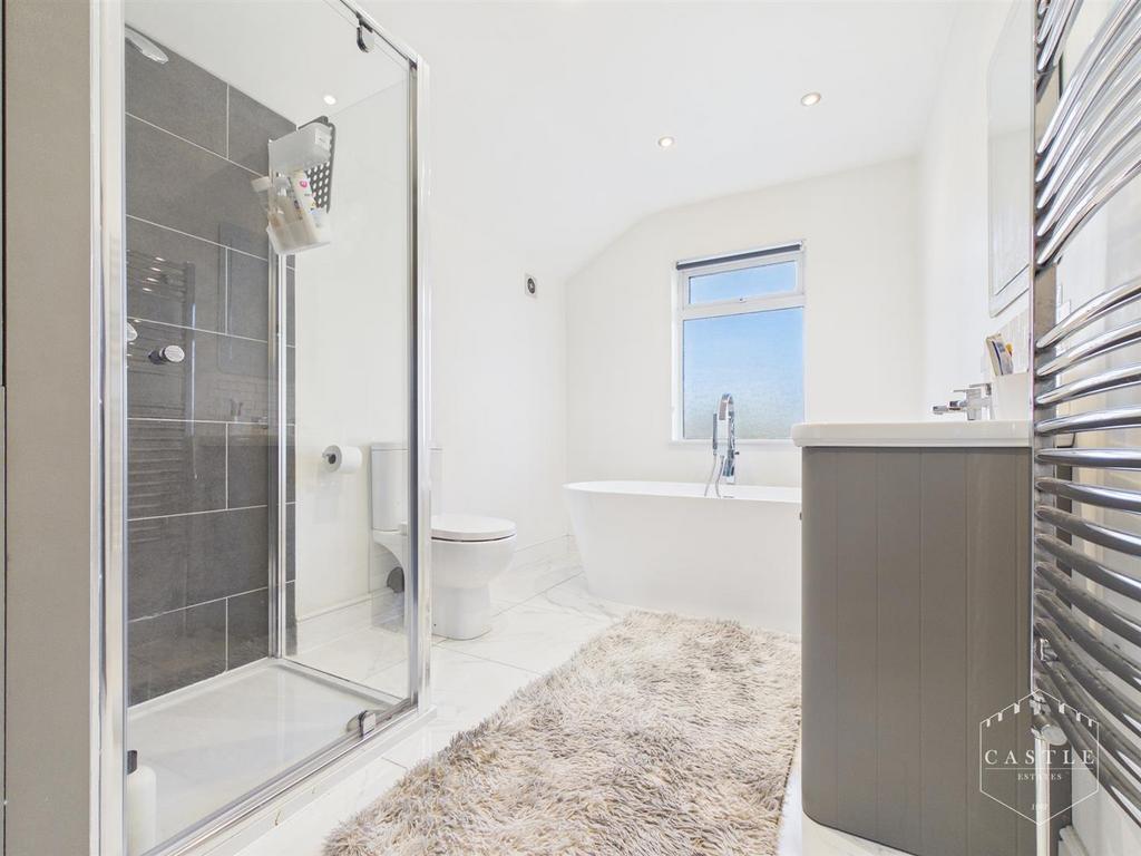 Bathroom - 3.56m x 2.21m (11'8 x 7'3) - having contemporary white suite including freestanding bath, separate shower cubicle, vanity unit with wash hand basin, low level w.c., chrome heated towel rail and upvc double glazed window with obscure glass.