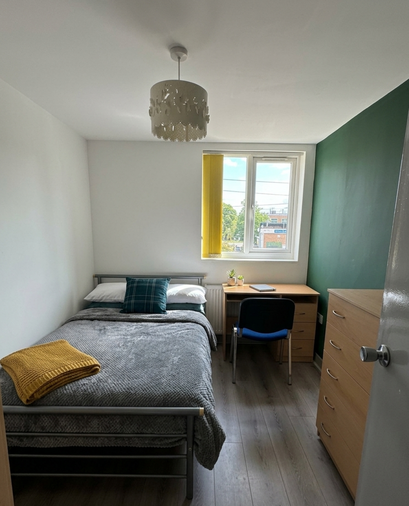 Each bedroom is thoughtfully furnished with a double bed, desk, wardrobe, chair, shelves, and a chest of drawers, ensuring a comfortable and productive living environment. The expansive property also features a generously proportioned living room, complete with a wall-mounted TV, and a well-appointed kitchen with spotlights illuminating the entire area. A dedicated dining section boasts a table and chairs for shared meals and gatherings.