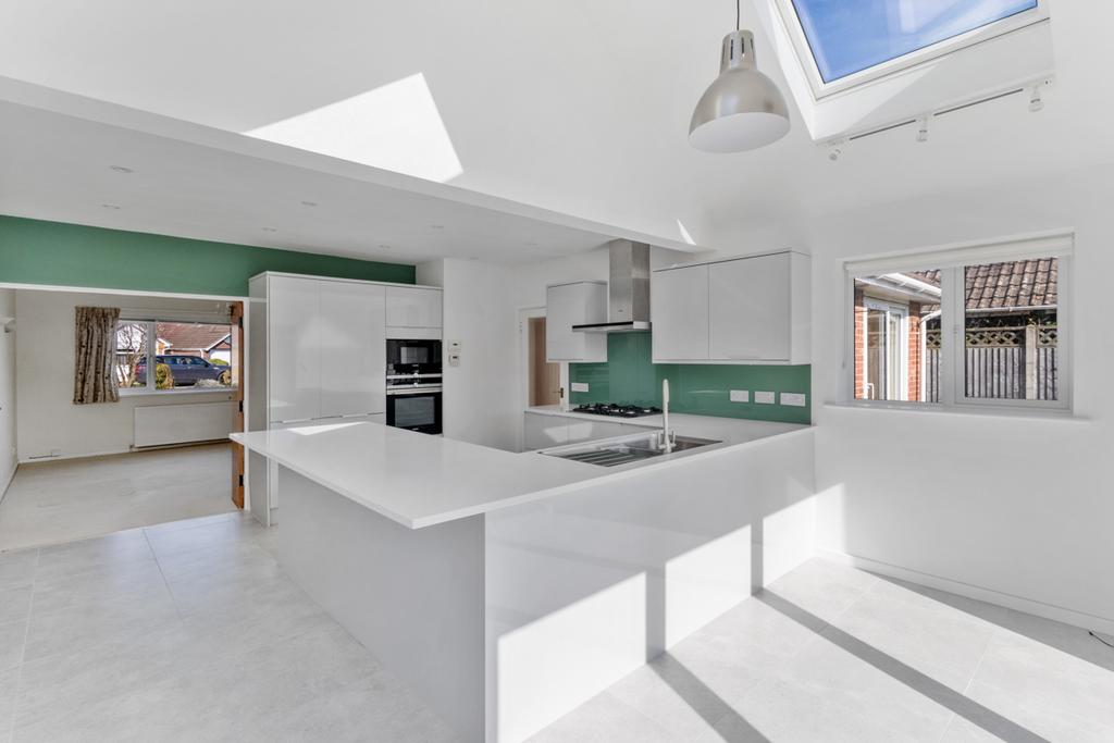 Double bi-fold doors lead to the rear from the sitting room into the impressive adjoining kitchen/family room which boasts a comprehensive range of modern fitted units and work surfaces incorporating a large breakfast bar, inset 1 1/2 bowl single drainer sink unit with mixer tap, integrated 5 burner gas hob with hood over, eye level microwave with oven under, concealed integrated fridge/freezer, washing machine and slimline dishwasher, pull out larder rack, along with tiled flooring with underfloor heating which flows into the family/dining area with feature vaulted ceiling with twin skylights, double glazed window to the side and bespoke tri-fold doors to the rear with electrically operated blinds, providing access into the rear garden.