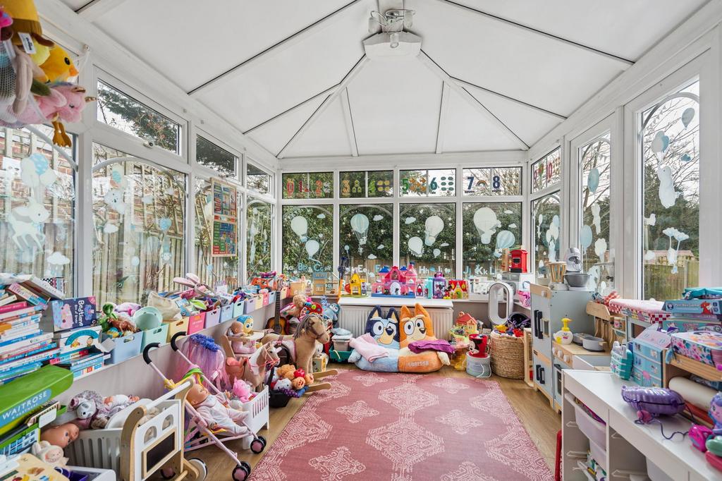 The property features a spacious living room that flows seamlessly into a dining room with doors leading out to a patio area. The well-equipped kitchen leads into a bright and airy conservatory, providing additional living space with direct access to the garden. A practical utility room and a downstairs w/c add to the home’s convenience.