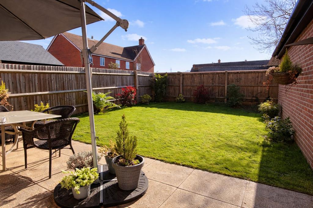 A south easterly facing rear garden. Paved patio area. Established lawn with a variety of plant borders. Outside tap. Outside lights. Gated side access.