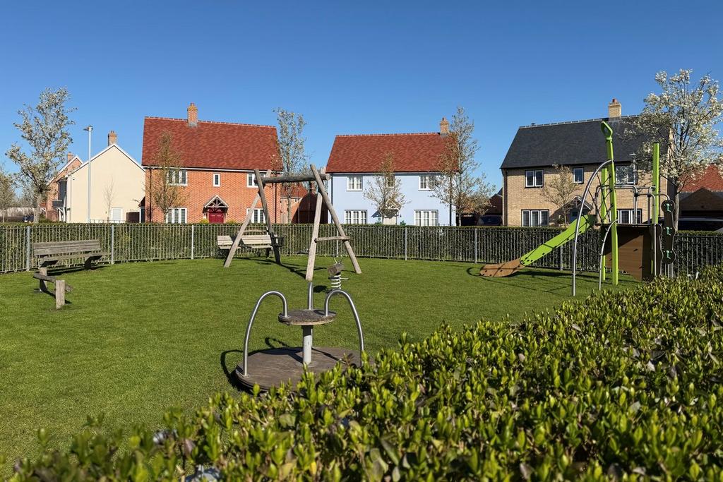 An attractive frontage overlooking a small play park. Path to front door. Area laid to lawn with a variety of shrubs. The driveway provides off road parking for several vehicles.