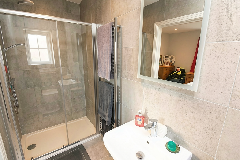 A white suite comprising a fully tiled double width shower cubicle with rainfall shower, pedestal wash hand basin and low level WC with concealed cistern. Shaver point. Heated towel rail. Fully tiled walls. Double glazed window to side. Extractor fan. Inset ceiling lights. Tiled flooring.