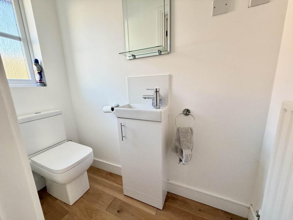 Double glazed window to the front. Modern suite comprising close-coupled WC. Wash hand basin. Cupboard below. Radiator.
