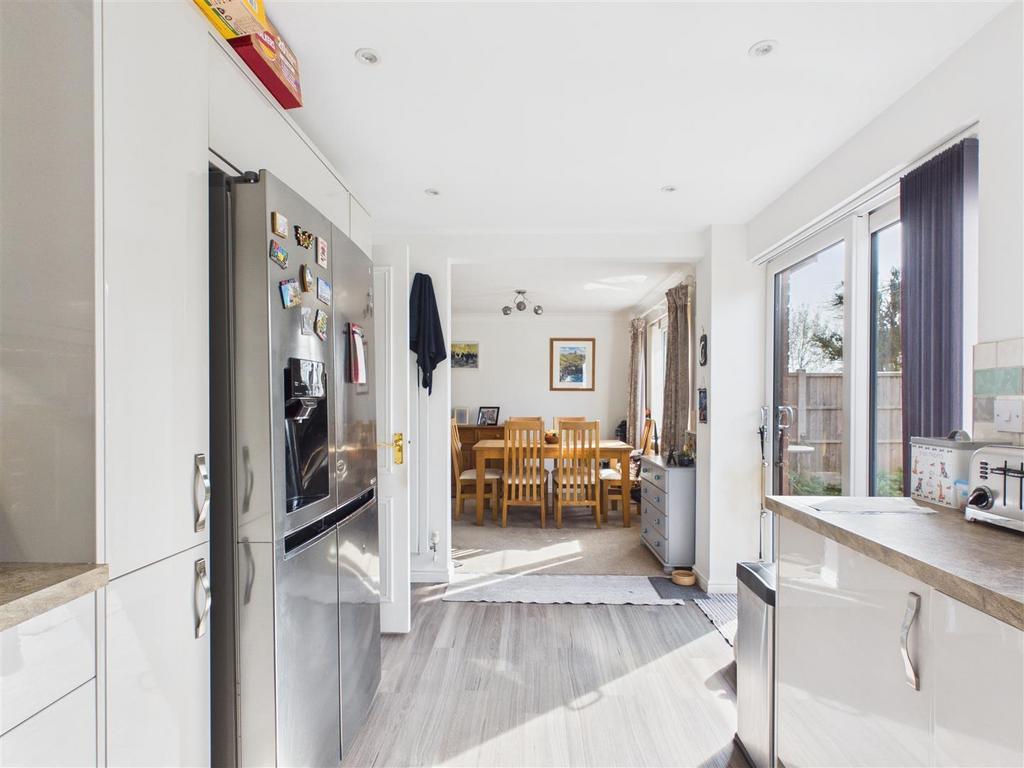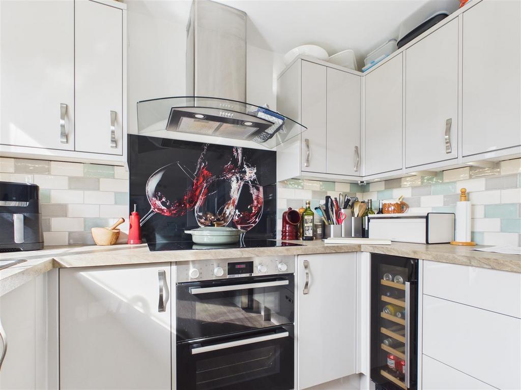 Kitchen - Vinyl flooring, mix of wall and base units surmounted by work surface. kitchen sink, tiles, kitchen benefits from integrated dishwasher, wine cooler, oven with hob and extractor over. UPVC window with rear garden aspect, with patio doors leading to the rear garden.