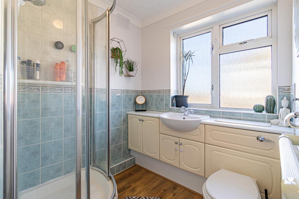 Upstairs, the first floor landing leads to three bedrooms, comprising two generous doubles and a smaller single bedroom, which would also lend itself well as a home office or nursery. The bedrooms are served by a neatly appointed shower room, fitted with a corner shower and a combination vanity unit with wash basin and WC.