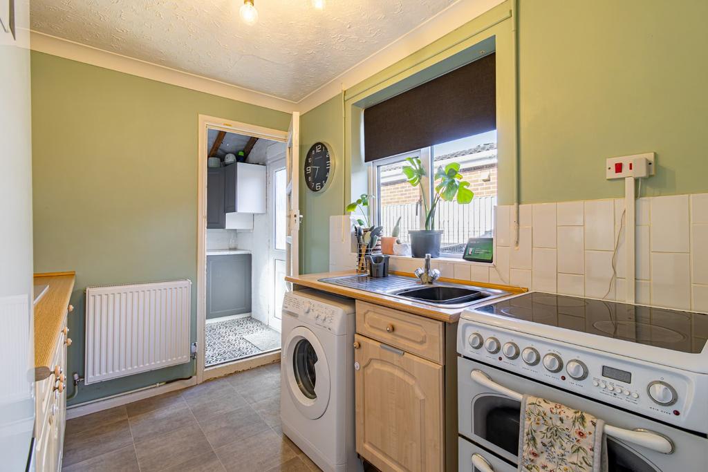Visitors are welcomed into the property via the entrance hall which connects the ground floor accommodation and features a useful cloakroom WC concealed beneath the stairs. From here, you step into the inviting living room, which is positioned at the front of the property and benefits from a large window allowing for plenty of natural light, along with an exposed brick fireplace housing an attractive log burner, creating a warm and characterful focal point. Continuing through the hallway, you reach the dining room, a versatile space that enjoys views over the rear garden and features a glazed door opening directly onto the patio area, making it ideal for both everyday use and entertaining. Adjacent to the dining room is the kitchen, fitted with a range of matching wall and base units providing plenty of storage, along with space for essential appliances, including plumbing for a washing machine. Off the kitchen is a useful utility area, offering additional storage and space for a tumble dryer, helping to keep household items separate from the main living areas.