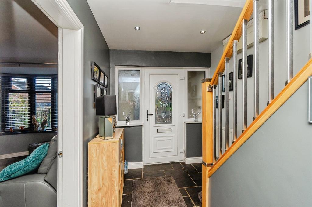 Having tiled flooring, ceiling spotlights, radiator, stairs to first floor, doors to living room, kitchen and guest WC, UPVC front entrance door and double glazed windows to the front aspect.