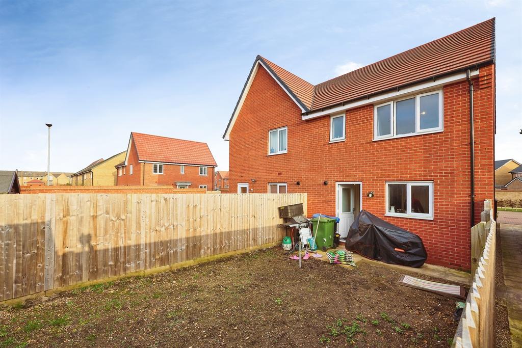 Fully enclosed rear garden, with small paved area. Garden shed.