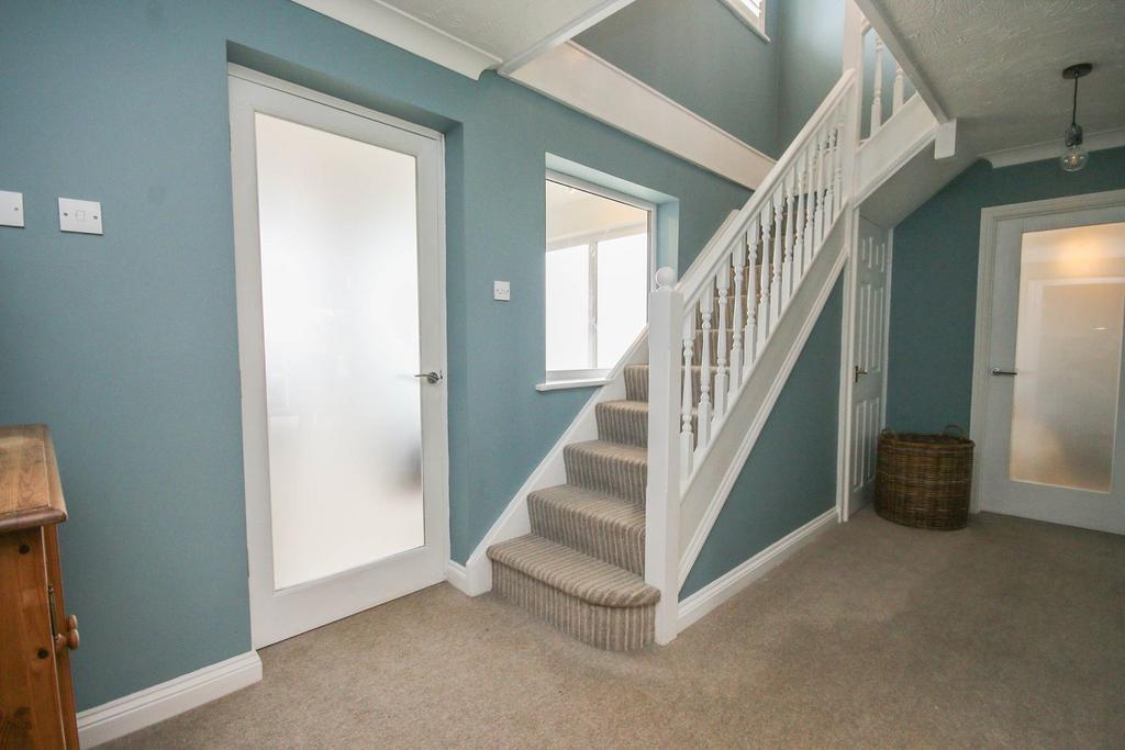Upstairs, a spacious landing with airing cupboard provides access to four well-proportioned bedrooms. The principal bedroom benefits from its own en-suite bathroom, fitted with a bath, low-level WC, and wash hand basin.