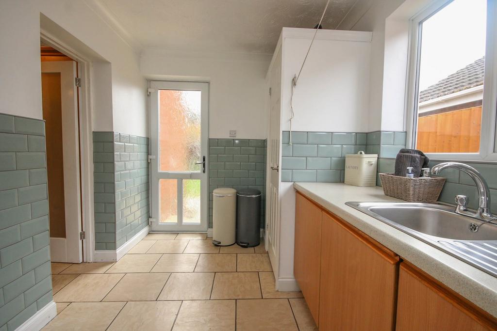The well-fitted kitchen features eye-level double ovens, space for a dishwasher, and upright fridge freezer, complemented by a tiled floor. A door leads through to the utility room which leads to a rear lobby with a cloakroom having space for a washing machine and tumble dryer. From the rear lobby, there is internal access to the double garage.