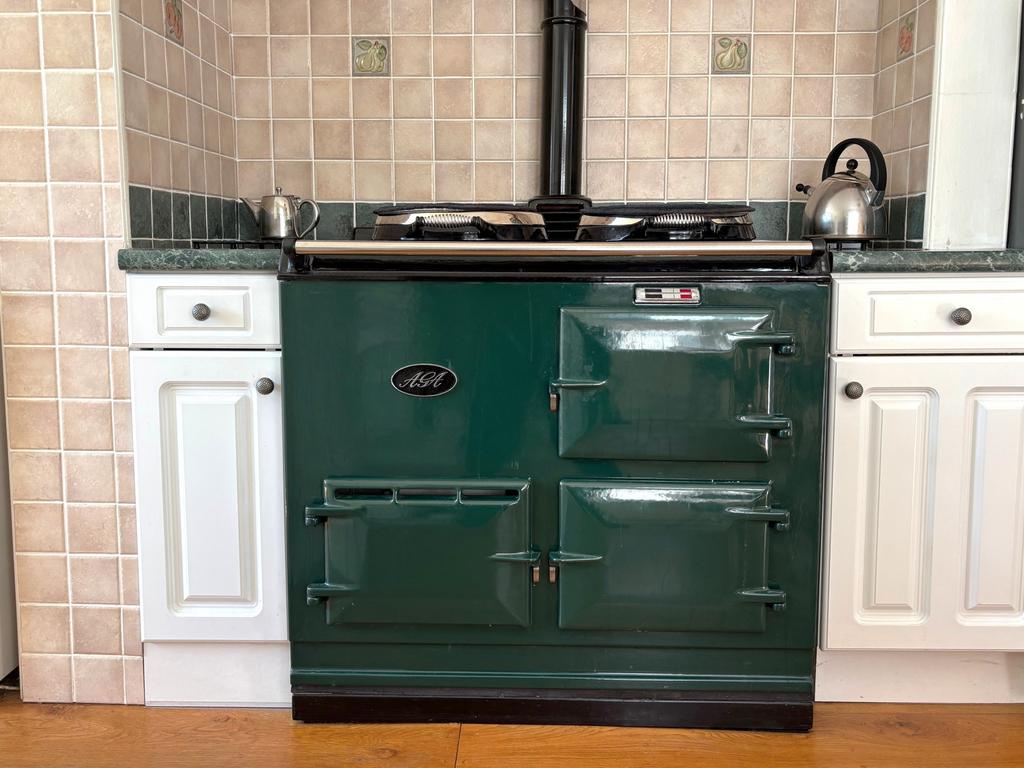 KITCHEN/BREAKFAST ROOM (SW & SE): 19'5" (5.93m) x 11'3" (3.45m). Single drainer sink unit and work surfaces with drawers, cupboards, space and plumbing for dishwasher under, 'Firebird' oil fired boiler, oil fired 'Aga', electric oven and gas hob, centre island with drawers and cupboards under, dining space, radiator, wall cupboards, fitted dresser unit to alcove, under stairs cupboard with fuse box and electric meter, space for fridge/freezer.