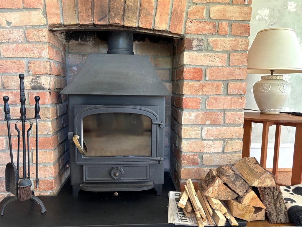 DINING ROOM (SW & NW):16'3" (4.95m) x 11'6" (3.51m). Radiator, wood floor, open fireplace with wood burning stove, central heating thermostat, UPVC double glazed doors to the rear garden.