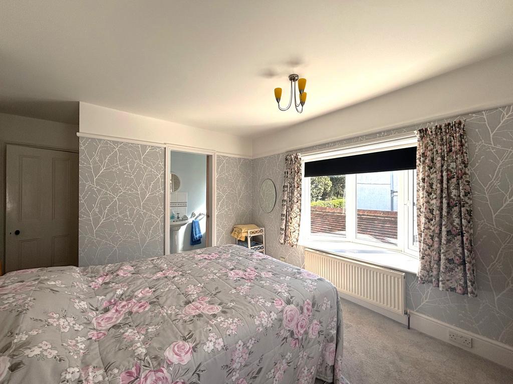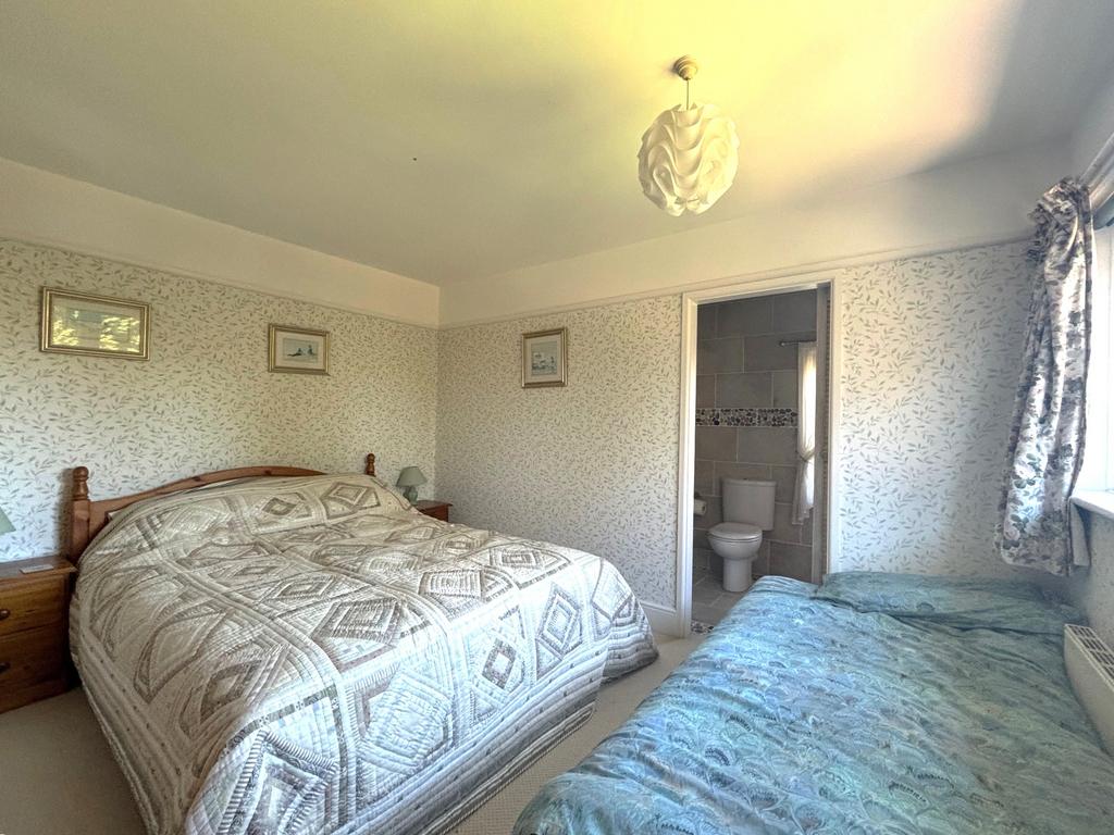 BEDROOM 2 (SE & SW) 16'2" (4.93m) into door well x 11'6" (3.5m). TV point, wall light, fitted wardrobe. Door to: EN-SUITE SHOWER ROOM/W.C.: Tiled shower cubicle with mains shower unit, wash basin with tiled splash back, low level w.c., obscure double-glazed window.