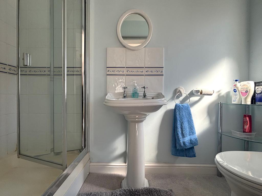 BEDROOM 3 (SW & NW):16'2" (4.94m) into door well x 11'5" (3.49m). Fitted wardrobe, radiator. Door to: EN-SUITE SHOWER ROOM/W.C.: Tiled shower cubicle with mains shower unit, wash basin with tiled splash back, low level w.c., tiled floor.