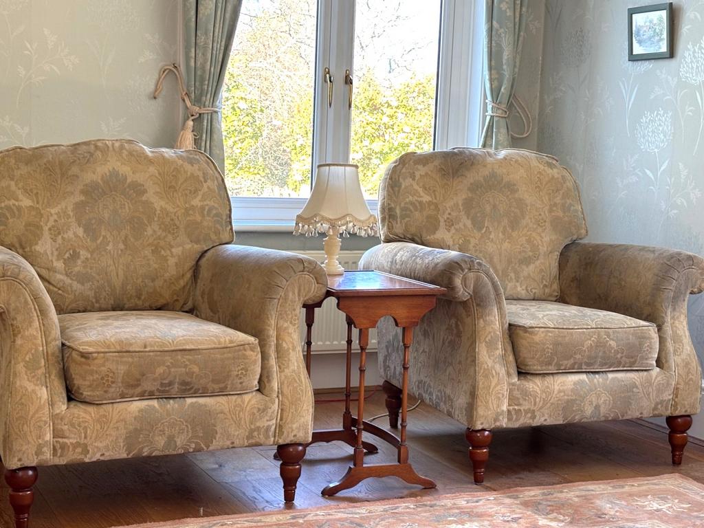 SITTING ROOM (NE & NW):17'7" (5.36m) x 15'3" (4.67m) into bay window. Two radiators, wood floor, open fire with marble surround and wooden mantle, wall lights, TV point.
