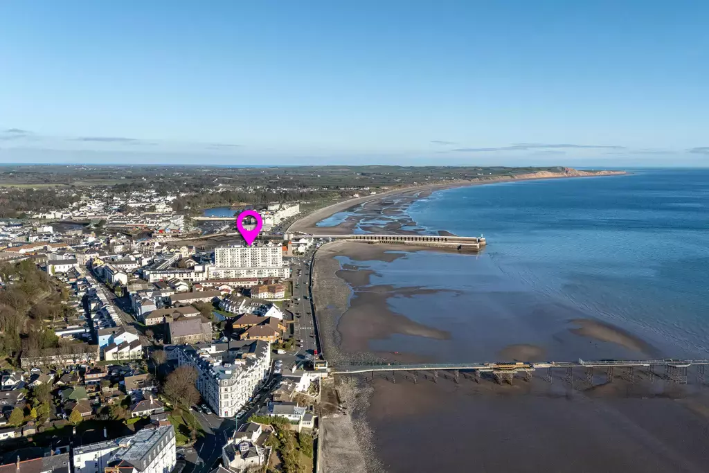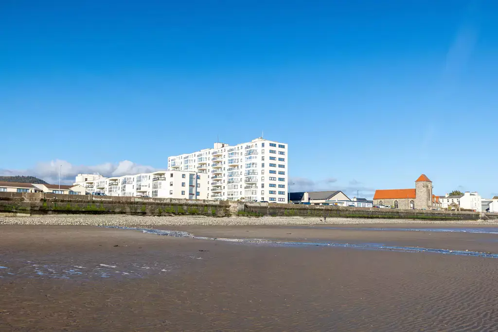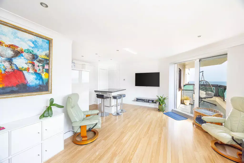 The apartment building is accessed via a secure automated door entry system, with lift access to the fifth floor. Inside, the accommodation is bright and well arranged, featuring a spacious living and dining area with a stunning modern fitted kitchen incorporating an island unit—perfectly positioned to take full advantage of the impressive coastal views.