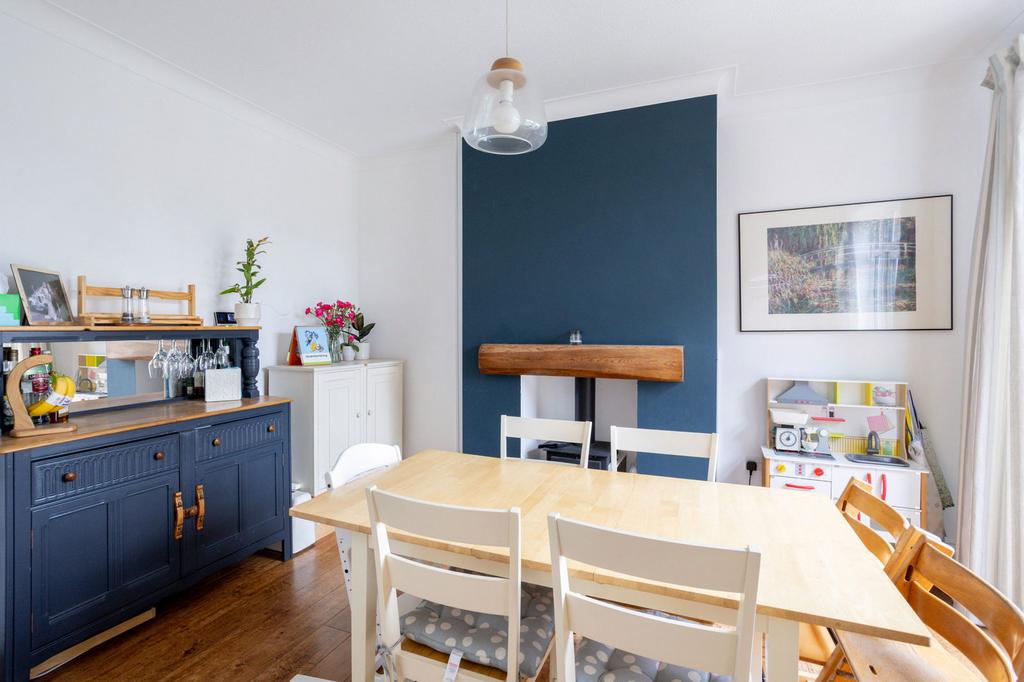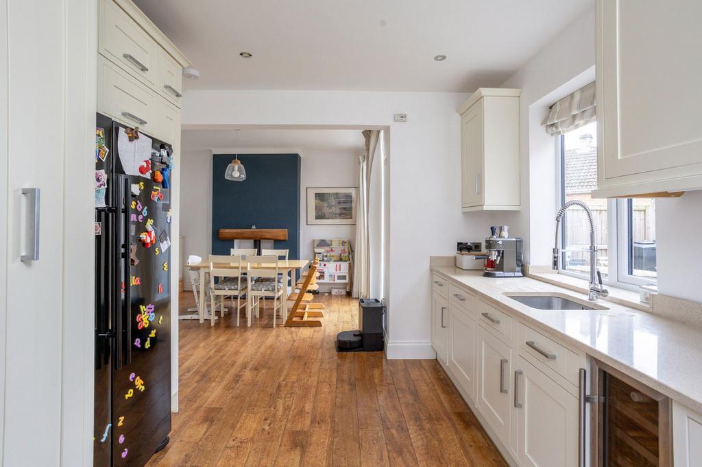 To the rear, the heart of the home is the extended kitchen and dining space. The kitchen is fitted with modern cream units, generous worktops and integrated appliances including a fridge freezer and wine fridge. A large window overlooking the garden brings in natural light, while the layout provides excellent storage and preparation space. The kitchen flows seamlessly into the dining area, where there is space for a table and chairs. A log burner set against a feature wall adds charm and warmth, making this a lovely space. Patio doors open directly onto the garden, allowing for easy indoor and outdoor living during the warmer seasons and making it ideal for children and entertaining alike.
