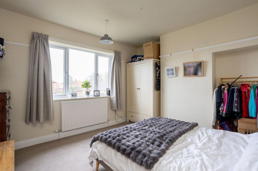 Upstairs on the first floor there are two well proportioned double bedrooms and a comfortable single bedroom. The main bedroom is bright and spacious, with room for wardrobes and additional storage. The second double bedroom overlooks the rear and offers a peaceful outlook, while the third bedroom would suit a child, nursery or home office. The family bathroom is generous in size, and mirrors the distinctive curved wall, and fitted with both a freestanding bath and a separate shower cubicle, offering flexibility for busy mornings and relaxed evenings.