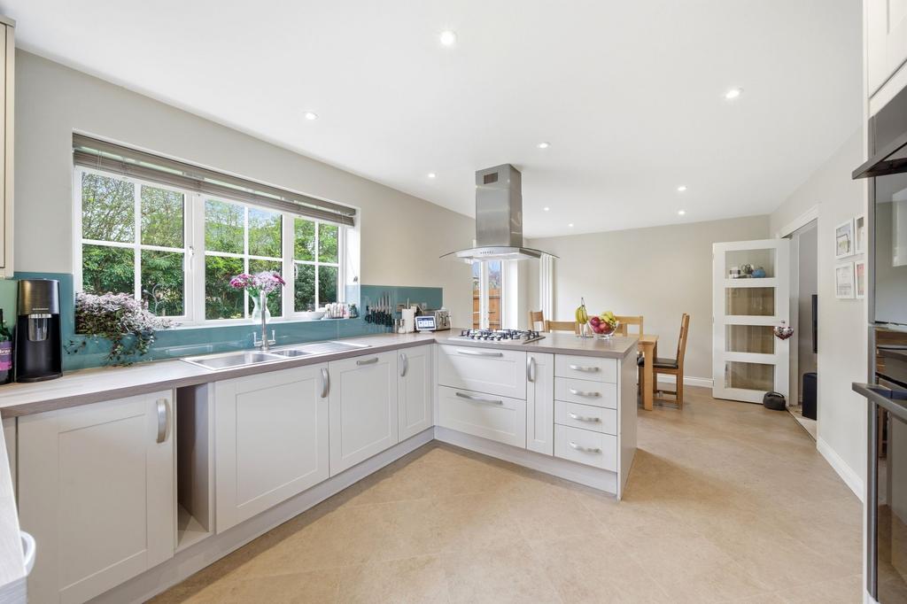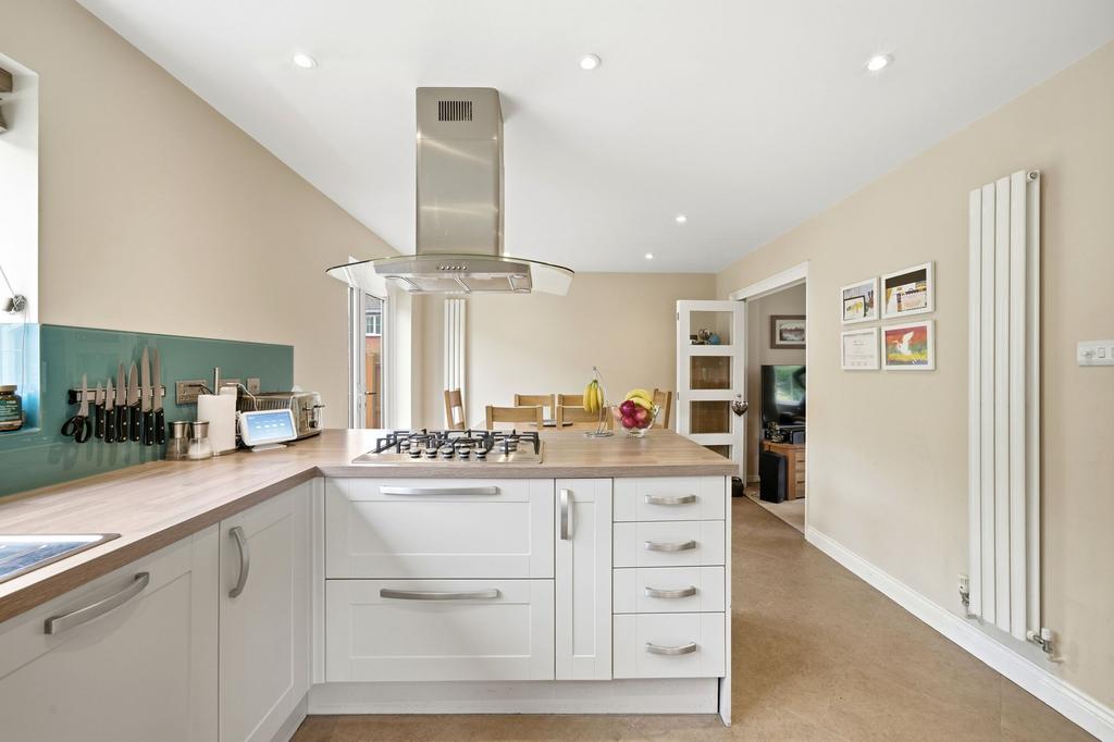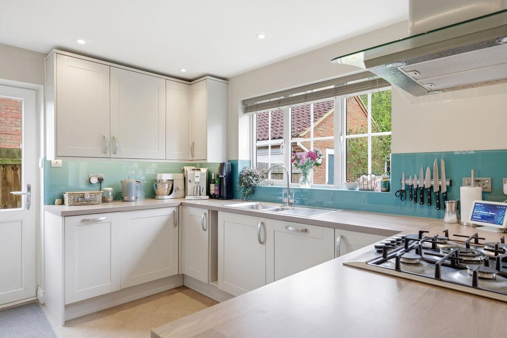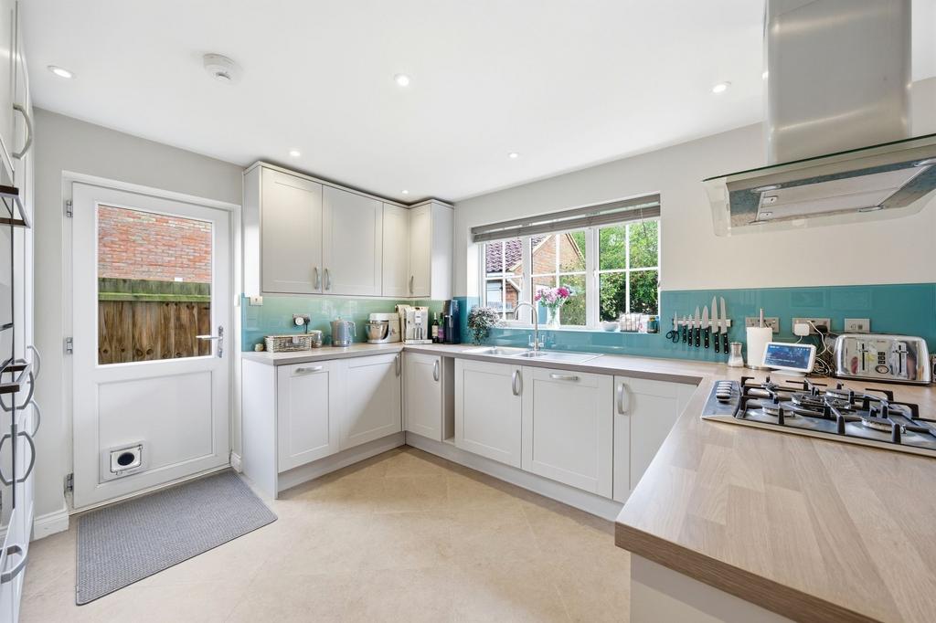 The property is located on Coxs End, a modern development located just off Mill Road. The ground floor comprises an entrance hall with cloakroom and understairs storage, with Amtico flooring flowing through into the kitchen/dining room. There is a bright living room featuring a bay window and a recently installed woodburner. Double doors lead to a refitted kitchen/dining room, offering ample space for a six-seater table, French doors opening onto the garden, and a side door providing access to the side gate/driveway. The kitchen is fitted with a contemporary range of units and includes integrated appliances such as an oven with grill and microwave, fridge/freezer, washing machine, dishwasher, and a five-ring gas hob.