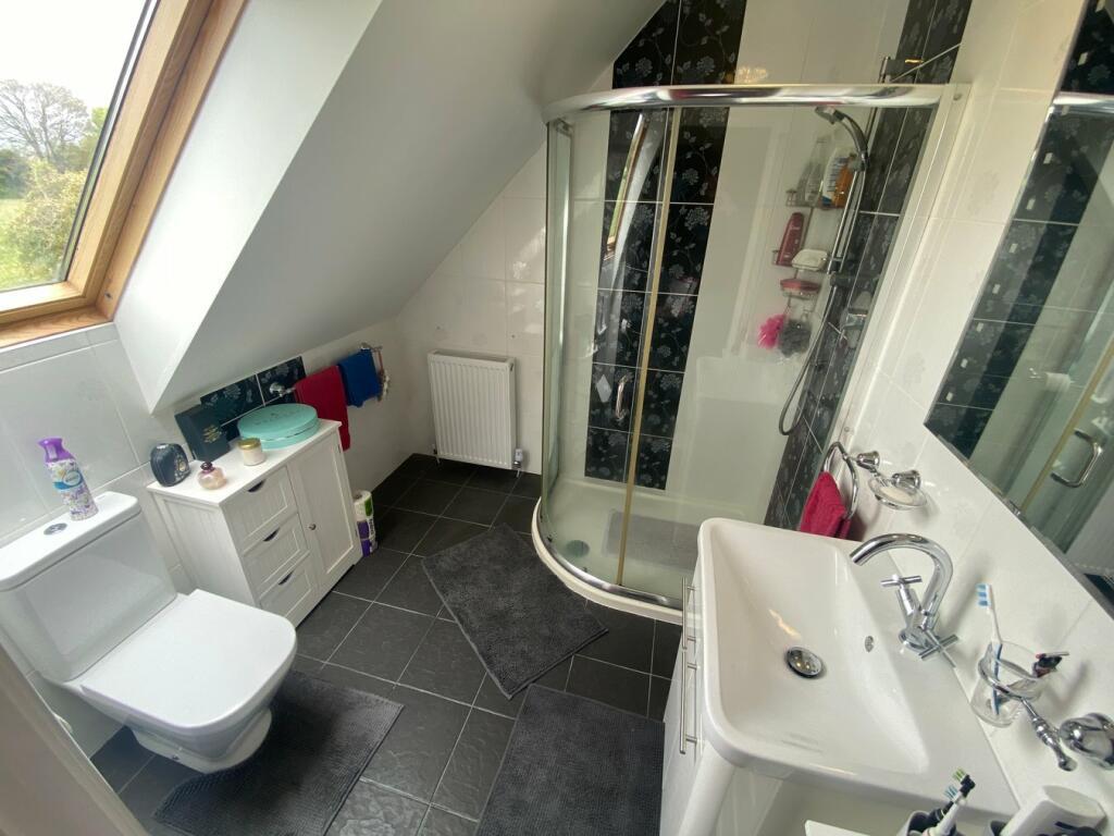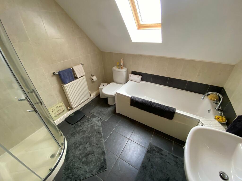 Bathroom 8’6 x 8’6 with slate effect ceramic tiled floor, Velux window to side, pedestal hand wash basin, WC, panelled bath, radiator, tiled walls, glazed corner shower cubicle with unit, part sloping ceiling.