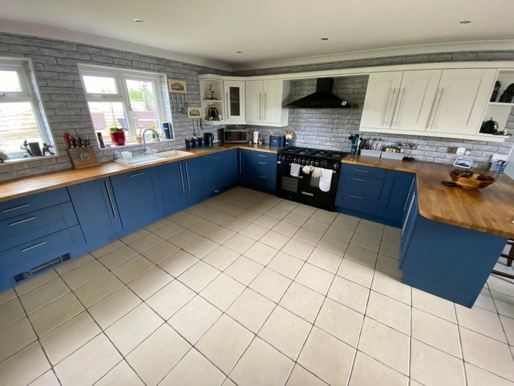 Kitchen/Breakfast/Living Room 23’2 x 16’5 with ceramic tiled floor, solid oak doors to fitted base and wall units with open fronted display area, single bowl drainer sink unit with mixer tap over, window to fore & 2 windows to rear, Breakfast Bar area, integral dishwasher, space for self standing fridge, freezer, ‘Rangemaster Professional + 110’ Range with 6 ring LP Gas Hob, extractor hood above and below with 2 ovens and warming compartment, radiator, brick effect splashbacks, seating/dining area to the front aspect, door off to: