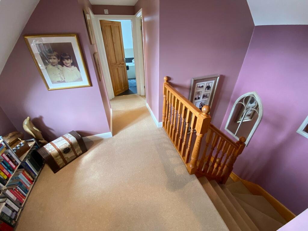 First Floor: Landing with dormer style window to fore, radiator, seating/storage area, 3 integral spotlights, double power point, doors off to: