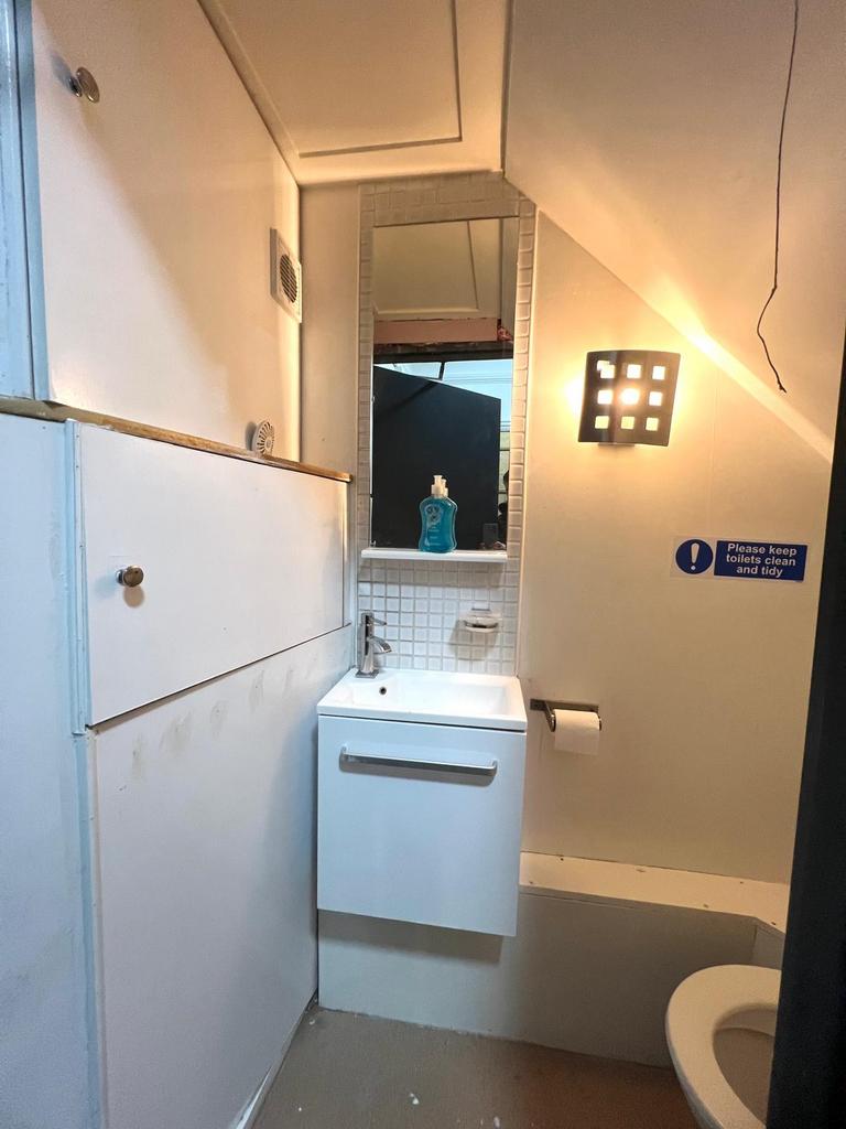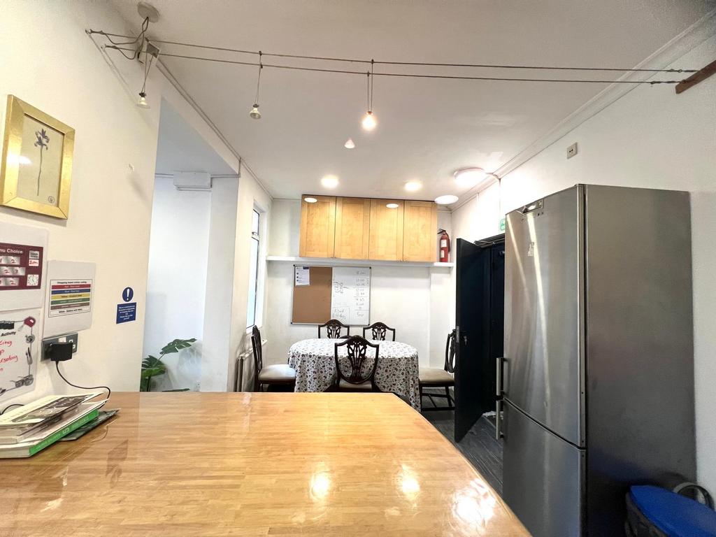 The ground floor features a bright reception room, opening to a spacious open-plan kitchen and communal area, ideal for shared living. The kitchen includes two sinks, two hobs, a washing machine, and fridge freezer.