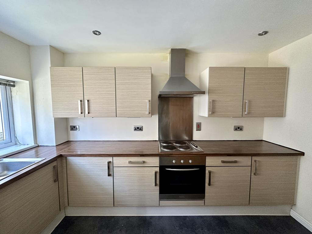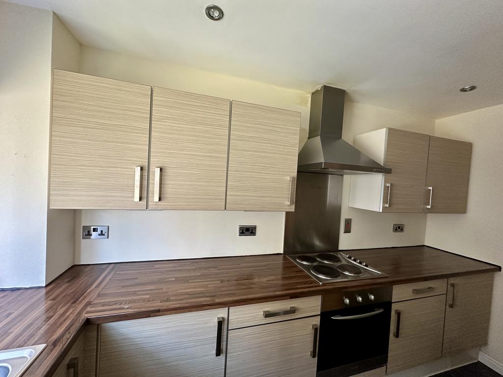 The apartment offers a sleek fitted kitchen with integrated appliances including a fridge/freezer, oven, hob and washing machine.