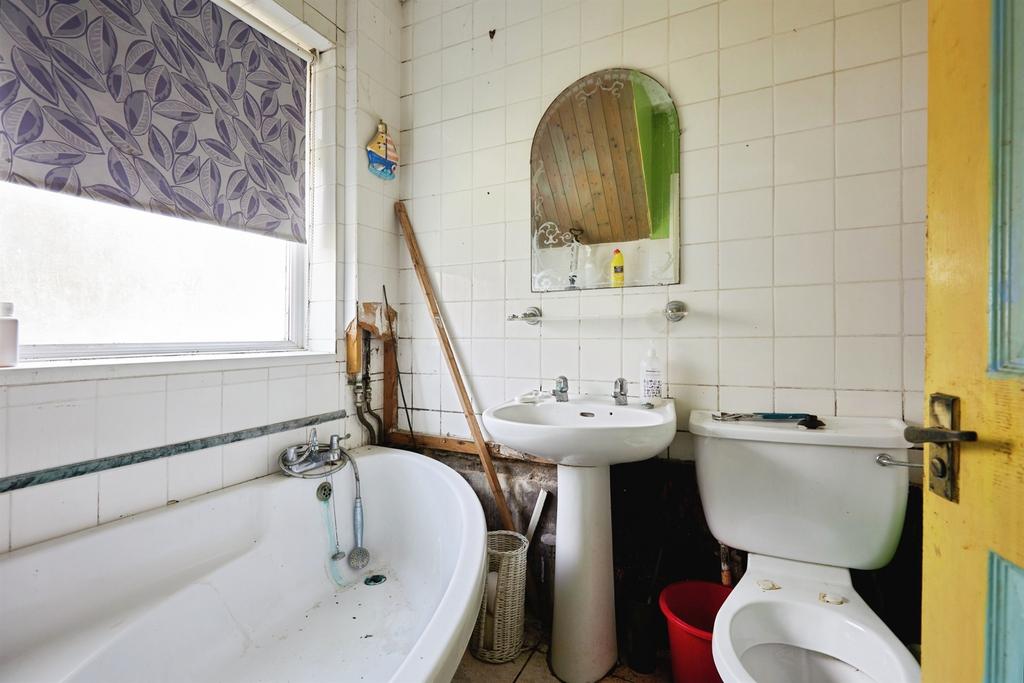 Obscured window to the front of the property, bath, WC, basin, heated towel rail