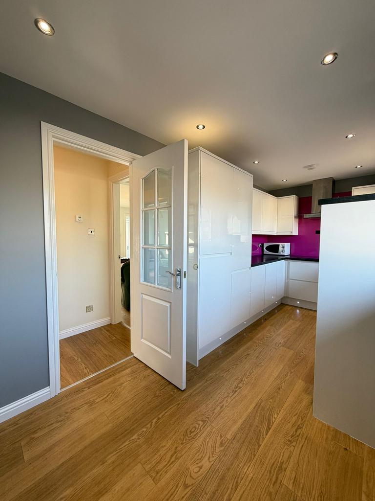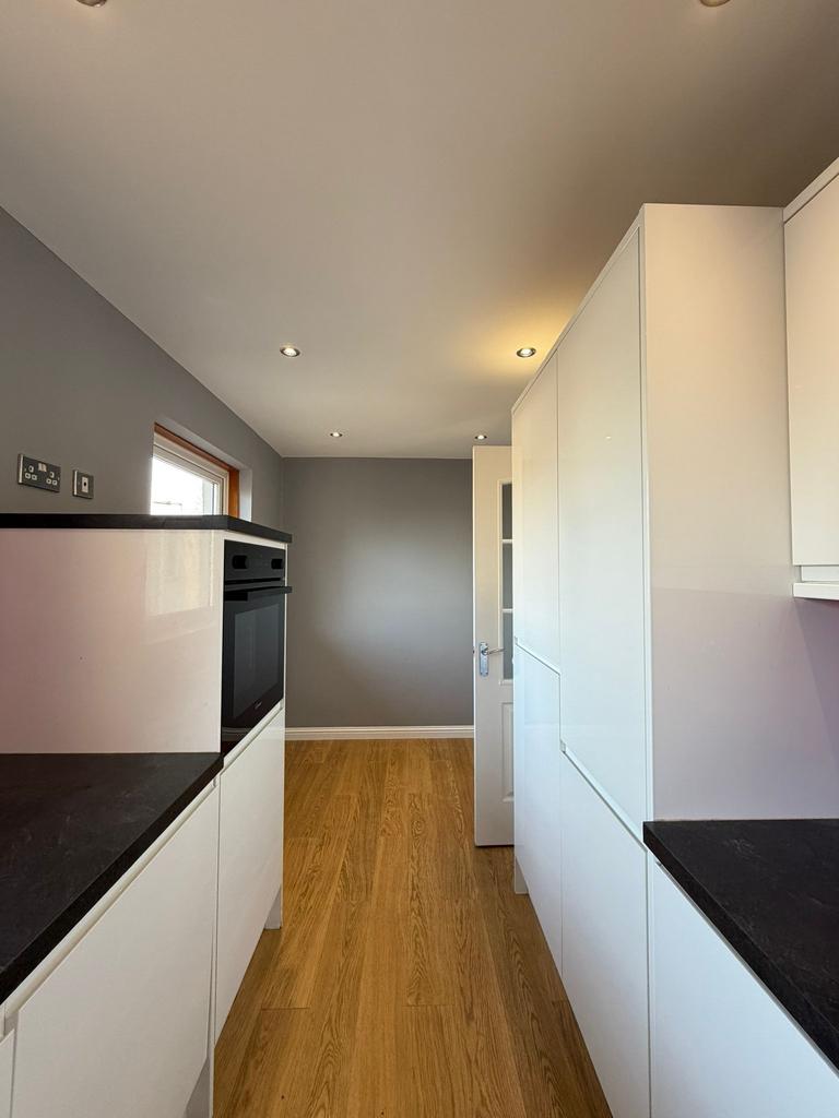 Continuing through a short hallway, you’ll discover the kitchen positioned across from you. Fitted with ample cupboard space along both the upper and lower walls, it offers plenty of storage, while still leaving room at the far end for a dining table—perfect for everyday meals or entertaining.