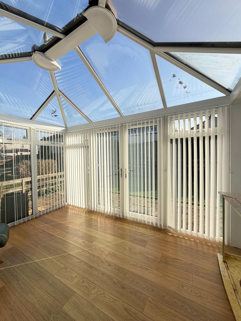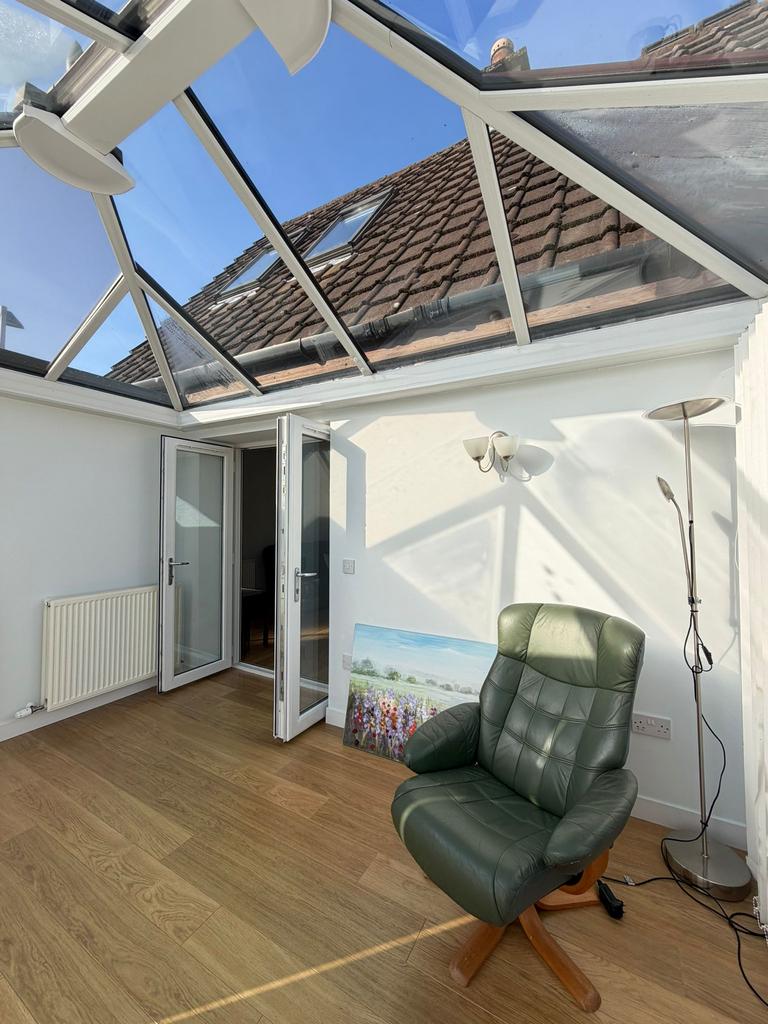 Straight ahead, the home opens into a large, welcoming living room. This space flows effortlessly through double doors into a bright glass conservatory—an ideal spot to unwind, enjoy a morning coffee, or simply take in the views of the beautifully maintained, floral garden beyond.