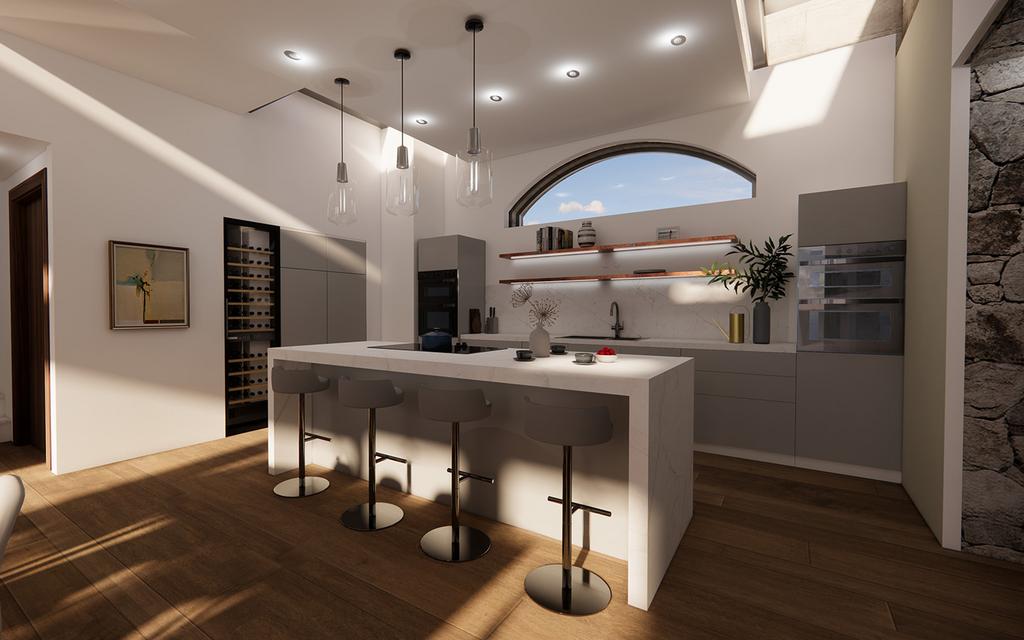 The two existing stone structures have been renovated and reimagined, and are now linked by large flat roof extension with a stunning glazed wall to the east elevation. This new space forms a dramatic kitchen and dining space at the heart of the home. The stylish kitchen features a large island/breakfast bar and an extensive range of designer units. Integrated Siemens appliances include an oven and separate oven/microwave, a warming drawer, fridge freezer, wine fridge, hob with downdraft extraction, and a dishwasher. A Bosch washing machine and separate tumble dryer are also included.