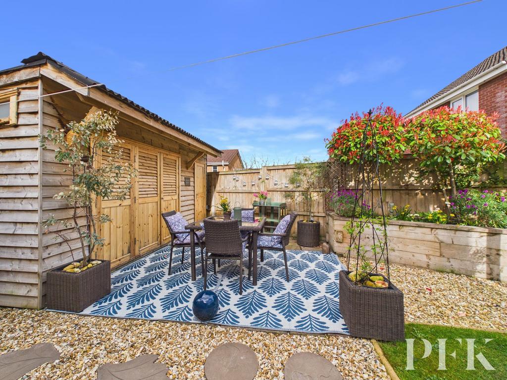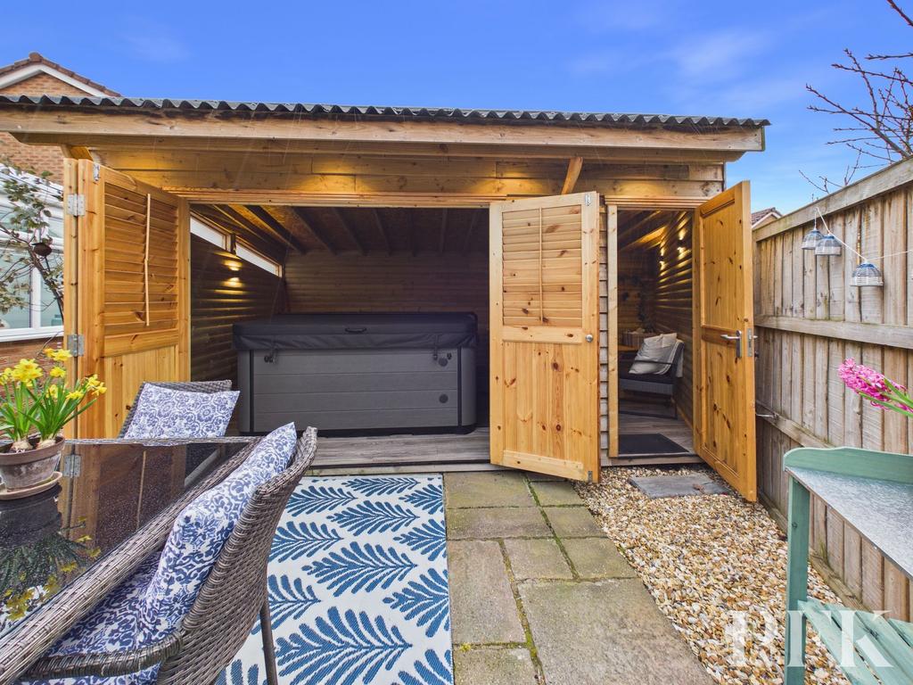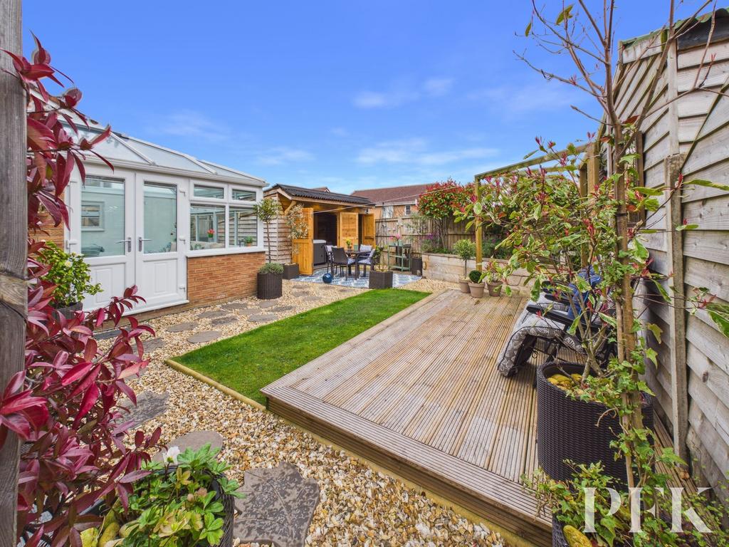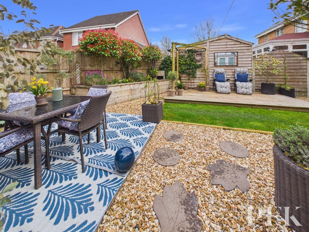 The landscaped rear garden offers a versatile outdoor space, featuring a blend of decked patio area, decorative gravel pathways and well planted flower beds. Designed for both relaxation and entertaining, it provides multiple seating areas across the patio and decking, perfect for social gatherings or leisure time. A standout feature is the conservatory, which opens seamlessly onto the garden, while a separate garden room houses a luxurious hot tub, creating an ideal setting for year-round enjoyment.