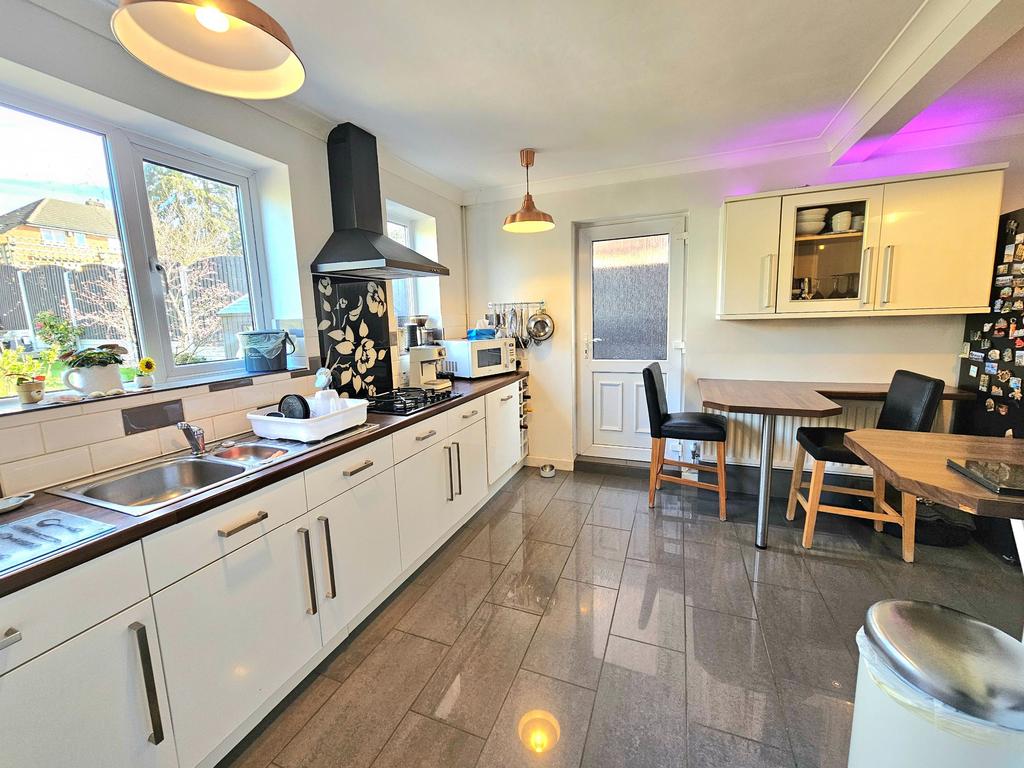 Luxury fitted kitchen with working surfaces and integrated four gas hob with extractor over and separate double oven, integrated dishwasher and space for fridge freezer, inset stainless steel sink and drainer, breakfast bar, radiator, two rear aspect double glazed windows, viny laminate flooring and under stairs storage cupboard. Side double glazed door to garden and door to utility room.