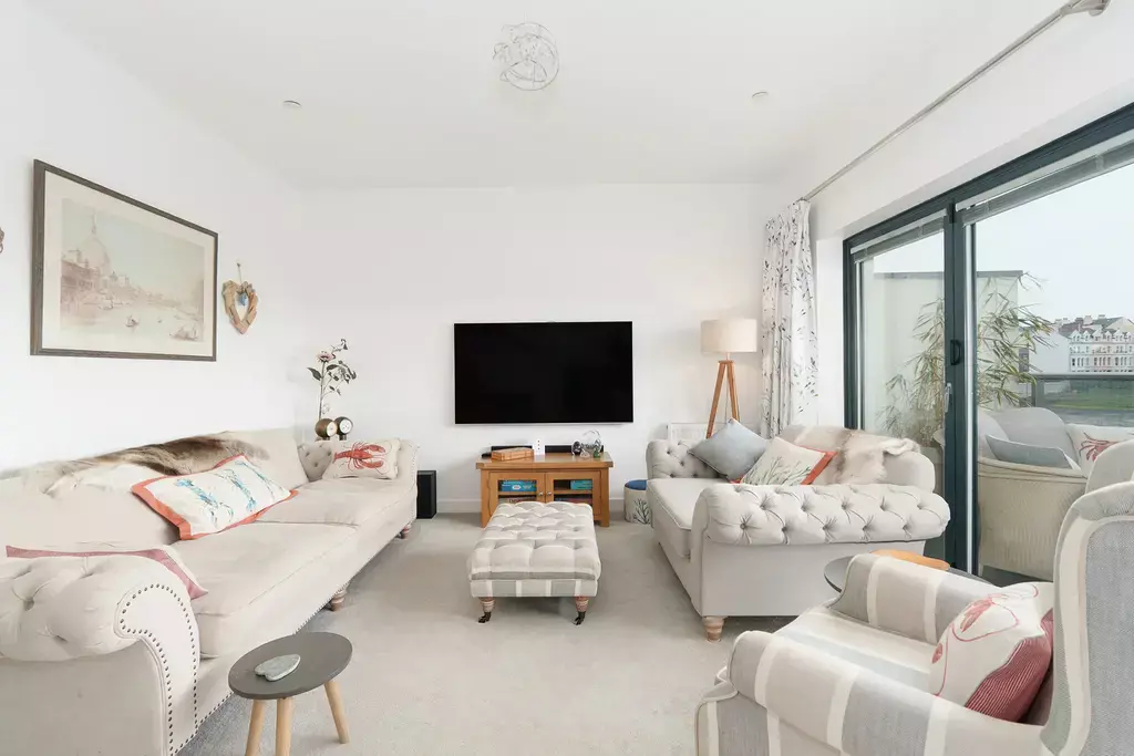 - Lovely first floor living room with a further set of bi-folding doors to the balcony with amble space for table and chairs, enjoying the fabulous elevated harbour views