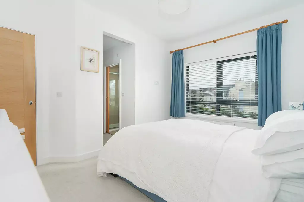 To the first floor is a lovely living room featuring a further set of bi-folding doors leading onto a balcony with ample space for outdoor seating, perfectly positioned to take in the superb elevated harbour views.