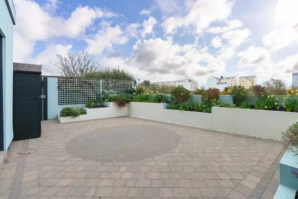 Externally, the property benefits from integral access to the garage, a side tandem driveway providing off-road parking for multiple vehicles, and a low-maintenance courtyard-style garden with paved patio and raised planters—ideal for relaxing or entertaining.