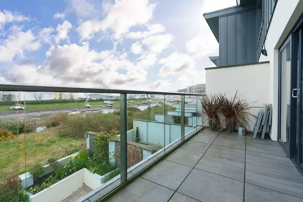 To the first floor is a lovely living room with a further set of sliding doors leading onto a balcony with ample space for outdoor seating, perfectly positioned to take in the impressive harbour views. A useful laundry/utility room is also located on this level.