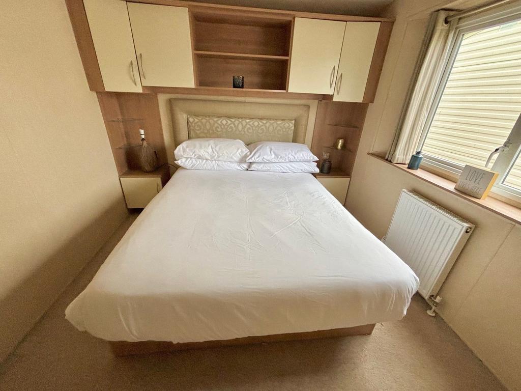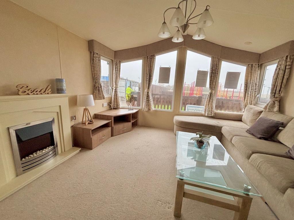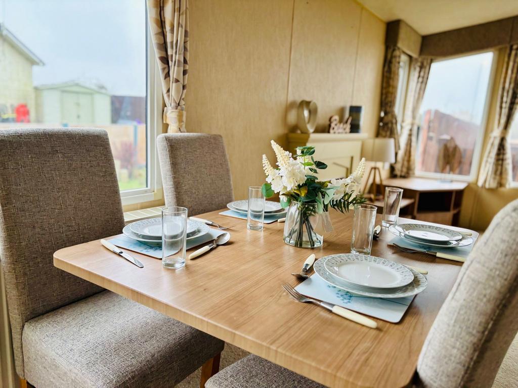 Inside, the caravan features a bright open-plan lounge and kitchen area, creating a welcoming space to relax after a day exploring the local coastline. The fully fitted kitchen includes a fridge-freezer, while double glazing and central heating help keep the caravan comfortable across the seasons.