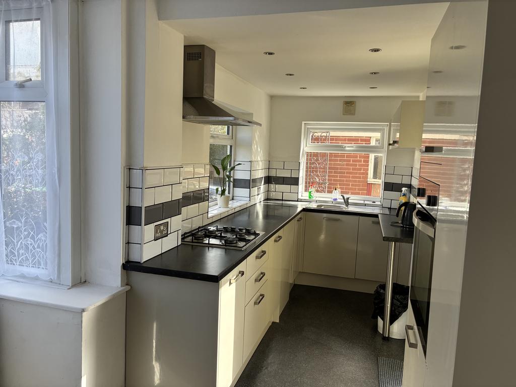KITCHEN 19’2 X 5’9. Fitted with a range of grey gloss style base units and worktops with bevelled edges incorporating a single bowl single drainer stainless steel sink unit with mixer tap over, gas hob, extractor hood, built in LAMONA oven, matching eye level cupboards, plumbing for washing machine, three UPVC double glazed windows, UPVC double glazed door to rear, radiator.