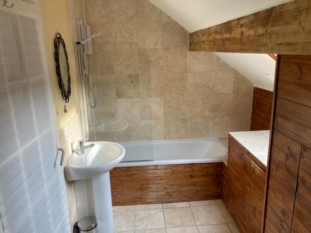 Attractive white suite with panelled bath with electric shower over. Tiled wall with shower screen. Double glazed skylight window. Useful storage cupboard. Travertine limestone tiles to floor