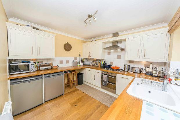 Range of oak wall and base units, block wood worktop surface and engineered wood flooring. Breakfast bar, integrated double oven with five ring gas burner hob and extractor hood above. Integrated dishwasher, space and plumbing for washing machine, space for fridge and freezer. Single drainer sink unit with chrome mixer tap, part tiled walls, UPVC double glazed window to the side.