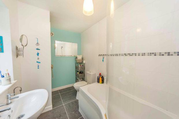 Three piece bathroom suite comprising panel bath with shower over, low level WC, wash hand basin. Tiled flooring, part tiled walls, smooth plastered ceiling. Cupboard housing central heating boiler, UPVC double glazed window to the side, radiator, extractor fan. Underfloor heating.