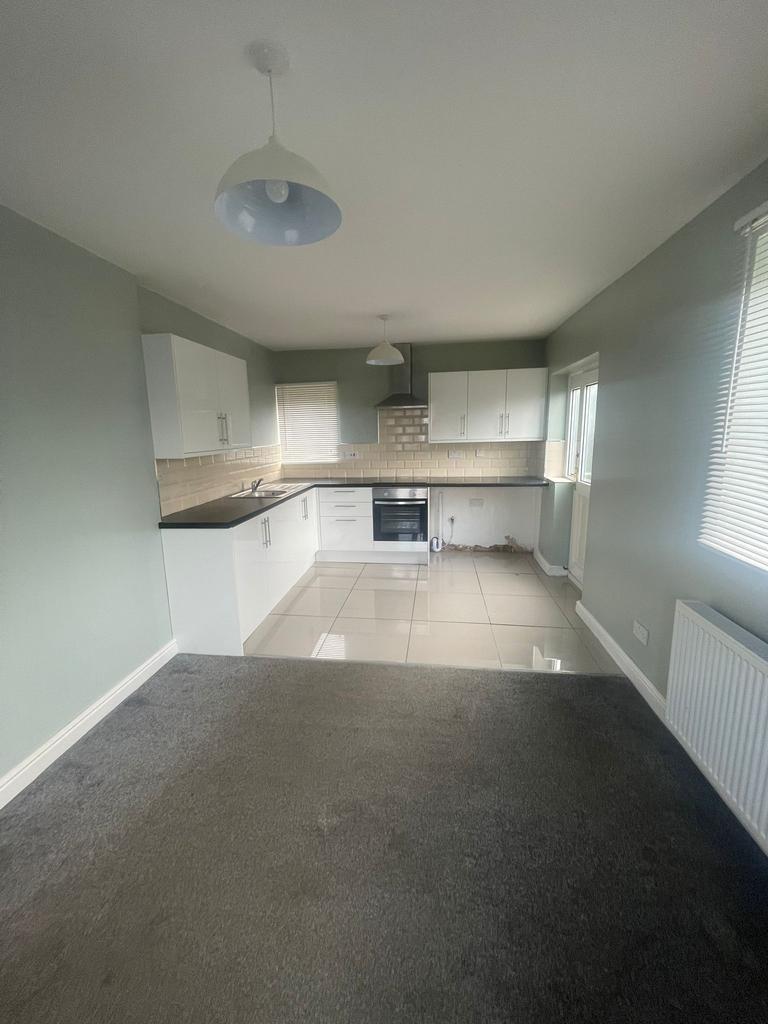 Fantastic open plan kitchen/lounge area with white high gloss kitchen units, stainless steel hob, oven and extractor and complementary stainless steel sink set atop a charcoal worktop which really sets the units off. Cream splashback tiling to all work surfaces and practical high gloss cream floor tiles.