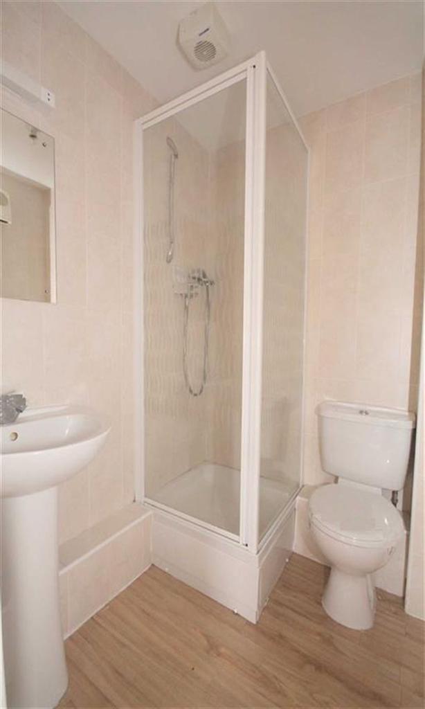 En Suite - A white suite comprising shower cubicle with mains fed shower, pedestal wash hand basin, wc, glazed tiling to walls, extractor, wall mounted heater, laminate wood effect flooring.