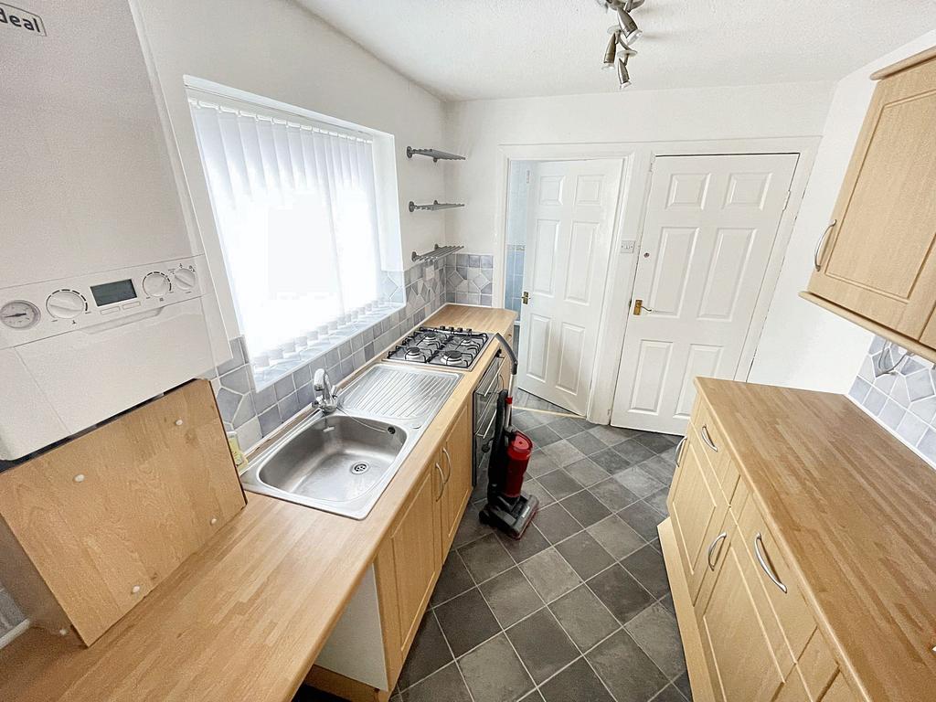 Fitted with a range of wall and base units with roll top work surfaces, stainless steel sink unit with mixer tap and splash back tiling. Electric oven and gas hob, plumbed for automatic washing machine. Double glazed window to the side and door to the bathroom.
