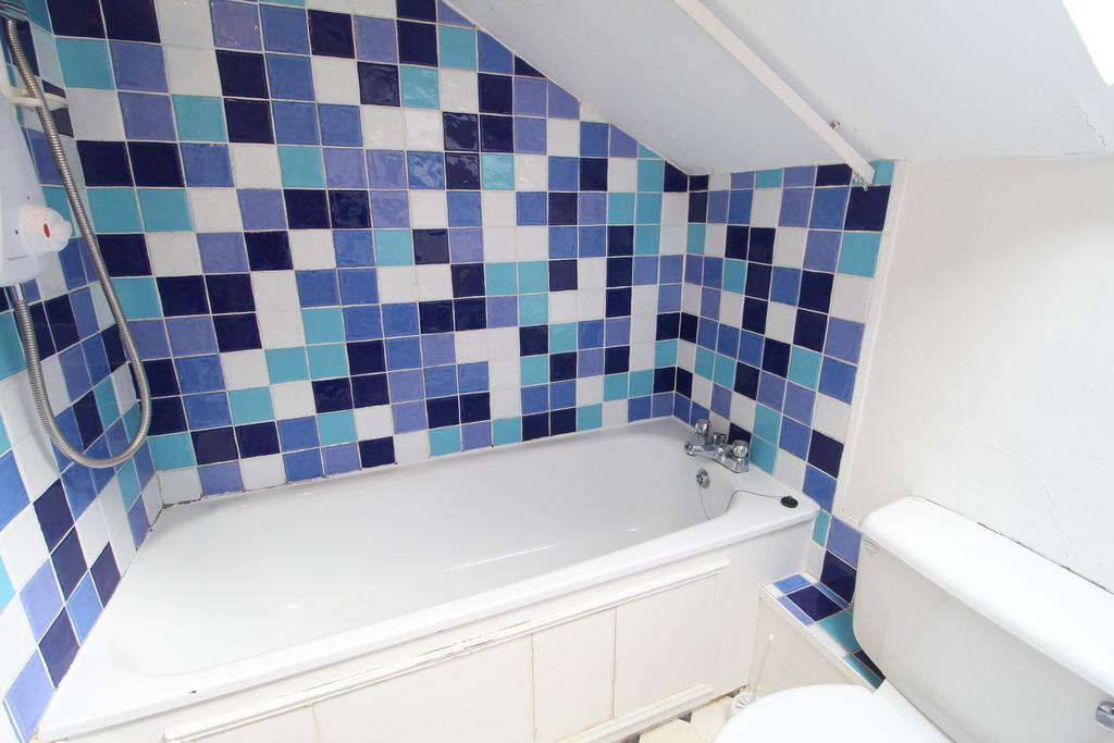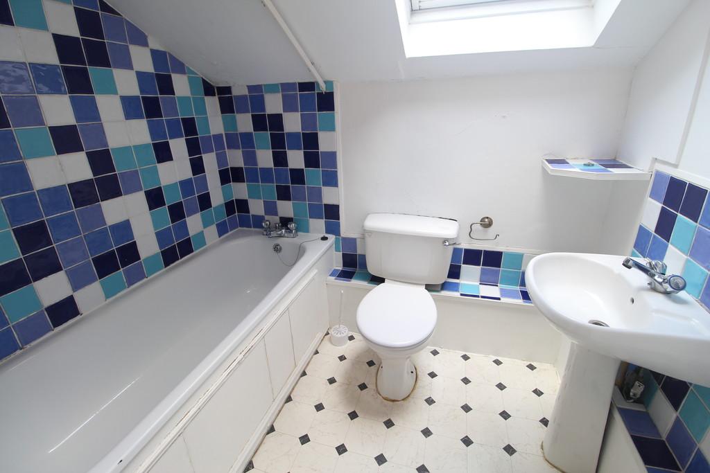 BATHROOM: 6' 09" x 5' 05" (2.06m x 1.65m) Suite comprising bath with mixer tap and electric shower over. Low level WC and wash basin with pedestal. Velux style window to rear aspect. Vinyl flooring. Electric night storage heater and wall mounted fan heater.