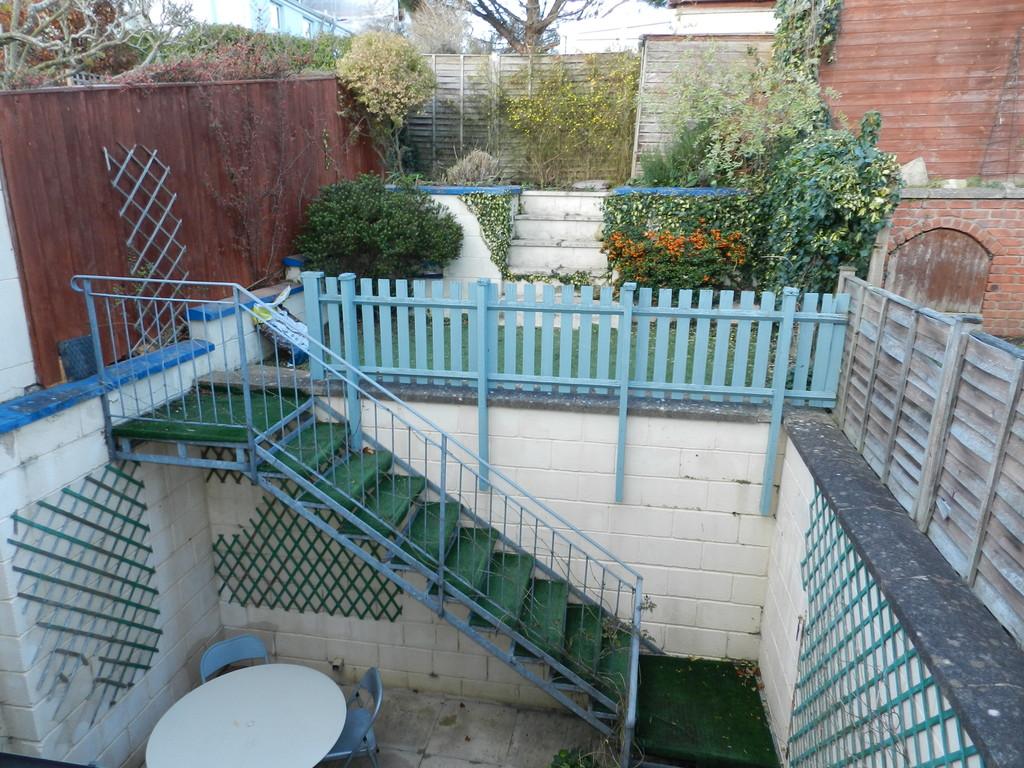 Outside to the rear, the courtyard garden is perfect for a secluded seating area and has steps up to a second level terrace and then further steps up to a storage shed.